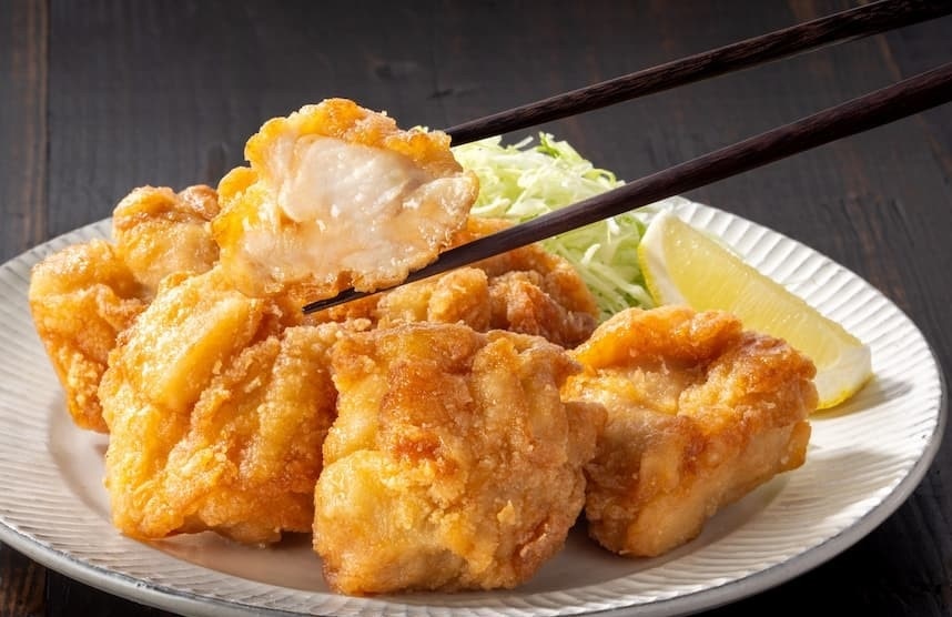 鶏もも肉、しょうがペースト、しょうゆ、食塩、醸造酢、しょうがパウダー、にんにくペースト、砂糖、ホエイパウダー、卵白粉、衣(でん粉、パン粉、小麦粉、大豆油、食塩、植物油脂、植物性たん白、ガーリックパウダー、オニオンパウダー、卵白粉、脱脂粉乳)、揚げ油(大豆油)/加工でん粉、増粘剤(加工でん粉、増粘多糖類)、調味料(アミノ酸等)、ポリリン酸Na、pH調整剤、乳化剤、ベーキングパウダー、香料、香辛料抽出物、(一部に小麦・卵・乳成分・大豆・鶏肉を含む)