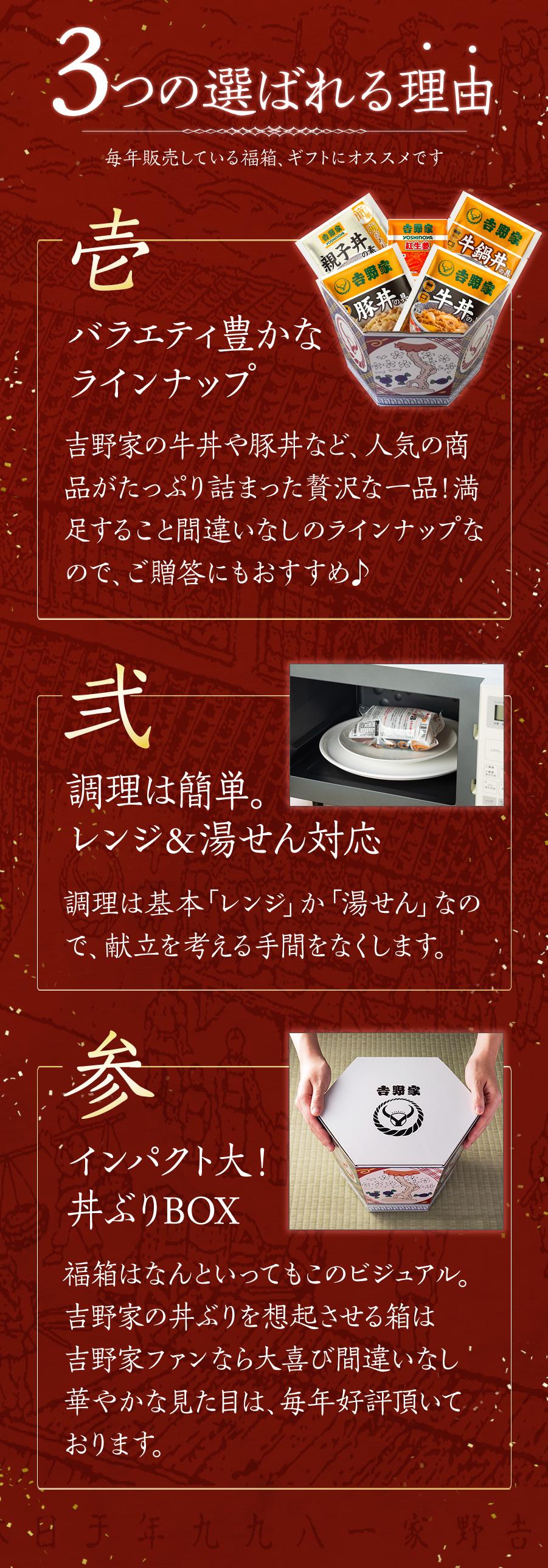 毎年お客様からご好評をいただいている福箱。人気の商品を詰め合わせた吉野家オリジナルどんぶり福箱セットです。 吉野家の店舗をご利用いただいているお客様はもちろん、普段お世話になっている方へのプレゼントにもぴったり。