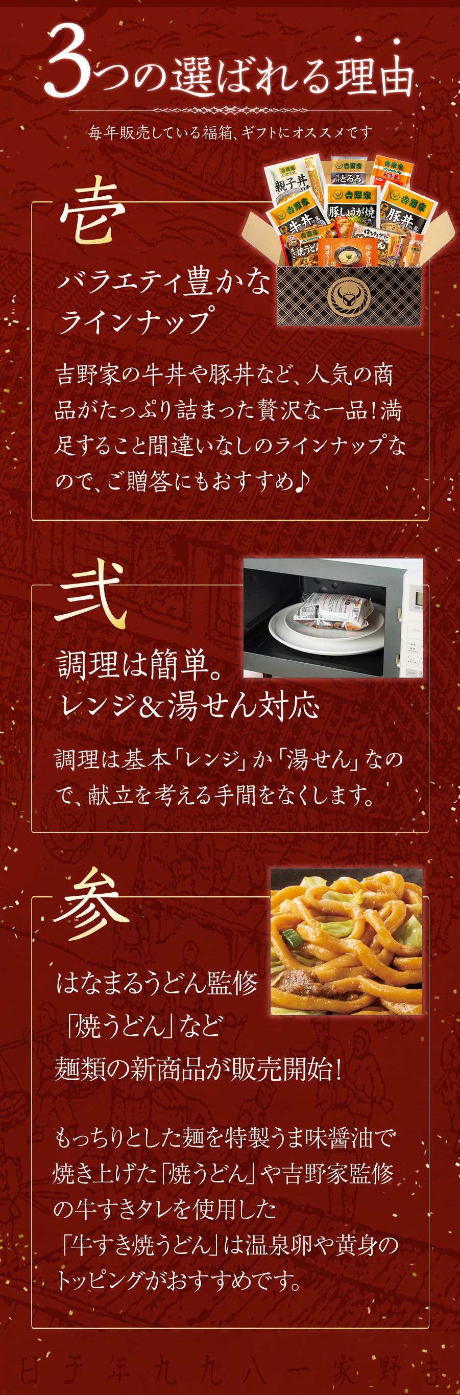 ・冷凍牛丼の具120g ×6袋・冷凍豚丼の具120g × 4袋 ・冷凍豚しょうが焼120g × 2袋・冷凍親子丼の素120g × 2袋・冷凍はなまる讃岐うどん254g × 1袋